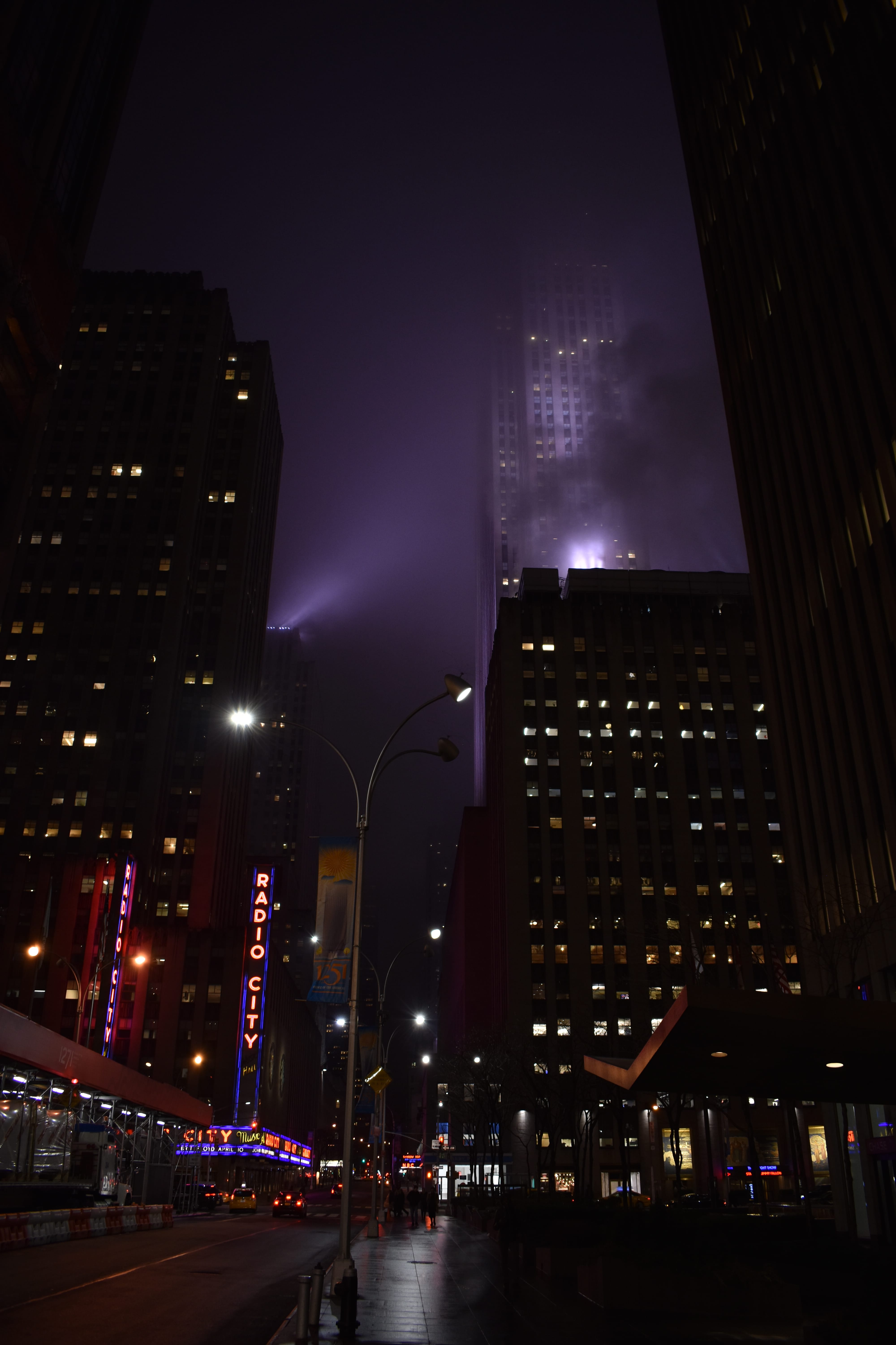 Radio City Music Hall on a foggy night