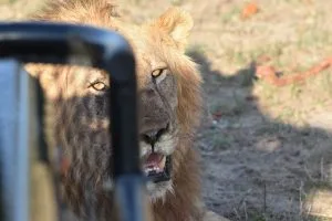 Lion getting shade from Land Rover