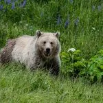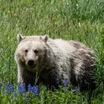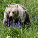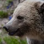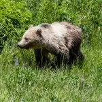 Over the years I’ve seen a few bears in the distance, but never up close. This time we had front-row seats to a female grizzly foraging and crossing the road in front of us.